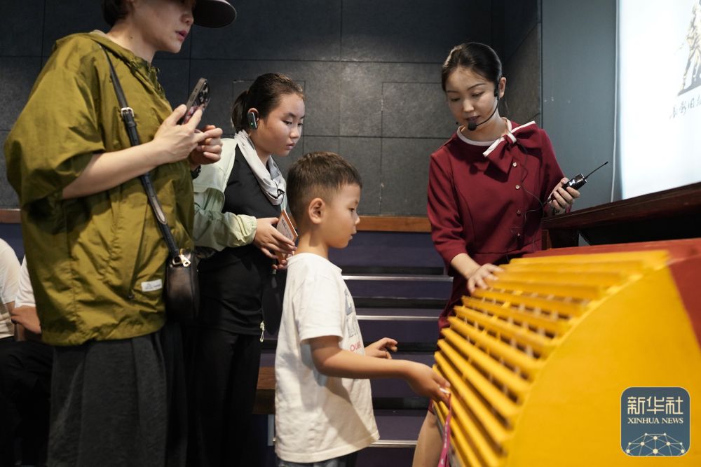 ↑ 8月7日,小朋友在長影舊址博物館擬音互動室參觀體驗。